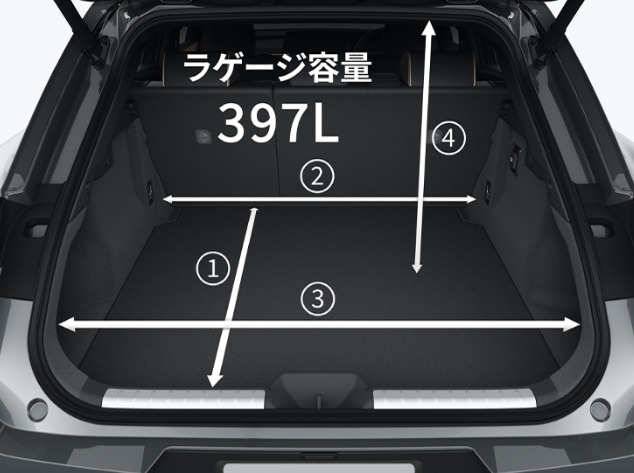 ラゲッジスペースは、397Lを確保。十分なスペースがあり、ゴルフバックを1個収納可能です。また、シートアレンジでリアシートを倒すと、4個まで収納できます。ラゲッジスペースの下には、デッキアンダートレイを設置。スペアタイヤやパンク応急処置キットなどを置いておけます。